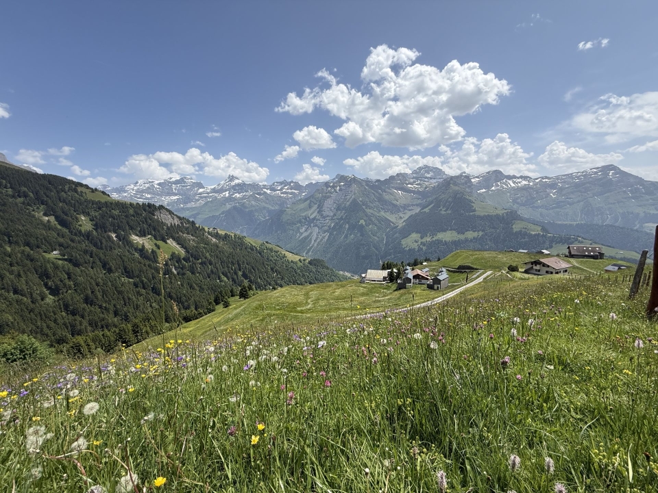 Schliesslich lichtet sich das Grün, und über mir grüssen die Fahnen des Berggasthauses Lipplisbüel. Die Wirtschaft gehört zu einem kleinen Hüttendorf auf einem weiten Hochplateau zwischen Blüemberg und Wasserbergfirst. Bei einer kleinen Erfrischung kommt Ferienstimmung auf. Die hübschen Knusperhäuschen strahlen Ruhe aus – stehen aber dicht gedrängt auf einem sicheren Plätzchen. Aus gutem Grund: Lawinen aus Ost und West begegnen sich hier im Winter.