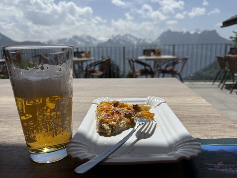 Bei Wiltschi kreuze ich den Schächentaler Höhenweg. Von hier sind es nur noch zehn Minuten hinunter zur Bergstation Kinzig Biel. Ein grosses Bier und eine feine Aprikosenwähe auf der Terrasse des frisch renovierten Alphotels an dieser betörend schöne Lage halten mich noch eine ganze Weile von der Talfahrt mit der Miniseilbahn nach Bürglen ab.