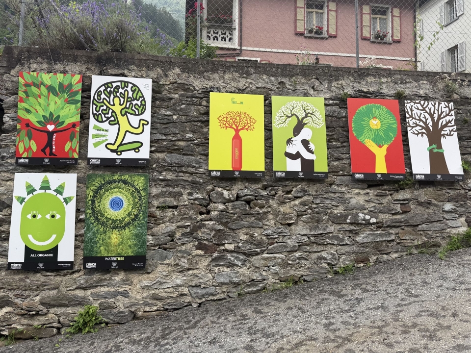 Also packe ich stattdessen das Postauto nach Rossa und will den normalen Hüttenweg hochsteigen. Dann werde ich weiter sehen. Ich rede mir gütlich zu, dass ich dafür das Tal ein bisschen besser kennenlerne, das ich von oben gar nicht richtig entdecken kann. Keine schlechte Idee, nicht wahr? Der Spass beginnt auch gleich mit einem Einblick in die Calanca-Biennale-2025 an der Bushaltestelle, einer Sammlung von Bauminterpretationen internationaler Künstler. Ich bin schon einmal positiv überrascht.