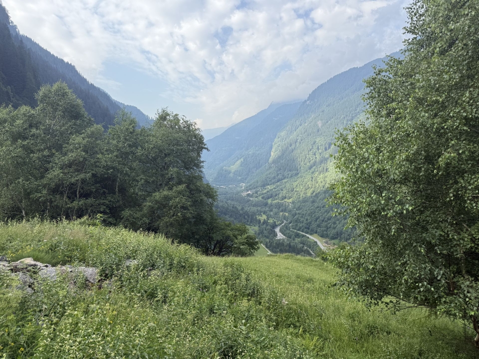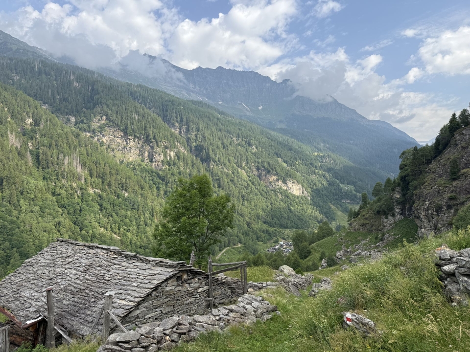 Der Hüttenweg beginnt derweilen gemächlich. Bis zum Einschnitt des Seitentals Val de l‘Ör führt er sanft steigend über saftige Wiesen, gestuft mit jahrhundertealten Steinterrassen und geprägt von schönsten Steinställen. Lieblich – aber es macht nachdenklich. Wer weiss denn schon noch, wie brutal der Kampf unserer Vorfahren um die Existenz in diesen Tälern war? Oft blieb nach einer Missernte nur noch die Flucht in die Stadt oder nach Amerika.