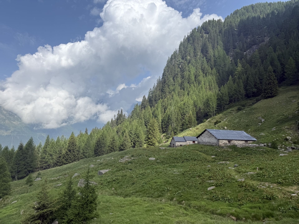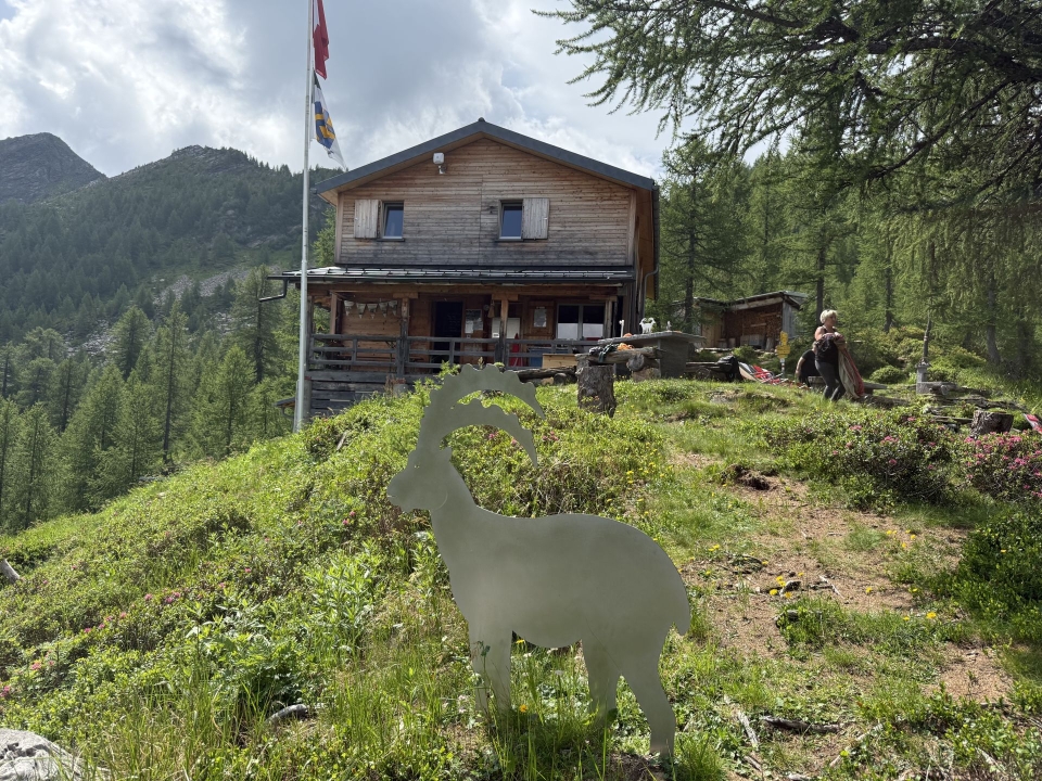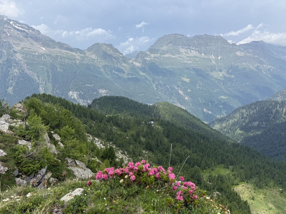 Auch die in Alpenrosen eingebettete Capanna Buffalora kommt bald in Sicht. Sie liegt schön eingebettet auf einem Geländevorsprung etwas unter der Baumgrenze. Ein schöner Bau, vor wenigen Jahren liebevoll modernisiert. Ich werde herzlich empfangen von Cate und Tiziana, die die Hütte für zwei Wochen als Volontari (Freiwillige) warten. „Schon da?“, begrüssen sie mich. Es ist erst halb Elf…