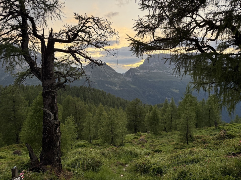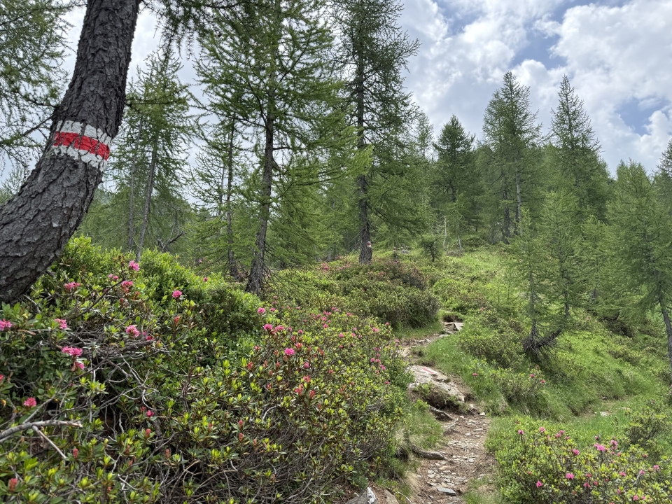 Jetzt wird es steil, richtig steil. Der Pfad schlängelt sich durch den Wald und ist von Baumwurzeln durchsetzt. Zum Glück steht die Sonne noch hinter dem Berg. Der schwülheisse Tag sorgt auch so schon für kräftiges Schwitzen. Auf einer kleinen Alp auf 1600m ist ein kurzes Verschnaufen erlaubt, dann geht es wieder fast gleich steil weiter zur weiten Alp de Calvaresc sott auf der nächsten Talstufe. Dort lichtet sich der Wald, locker verteilte Lärchen und unzählige Alpenrosen schmücken den Weg. Hin und wieder schlängelt sich ein Bächlein durch das gutmütige Gelände. Wie gestern unterhalb der Alpe Rossignion. Traumhaft!