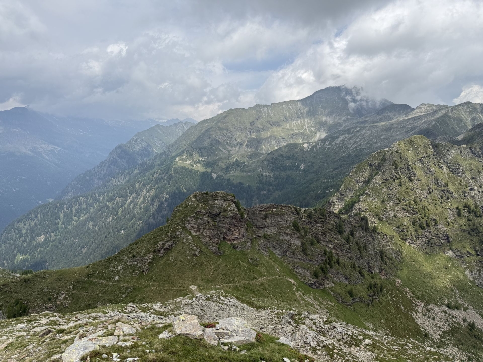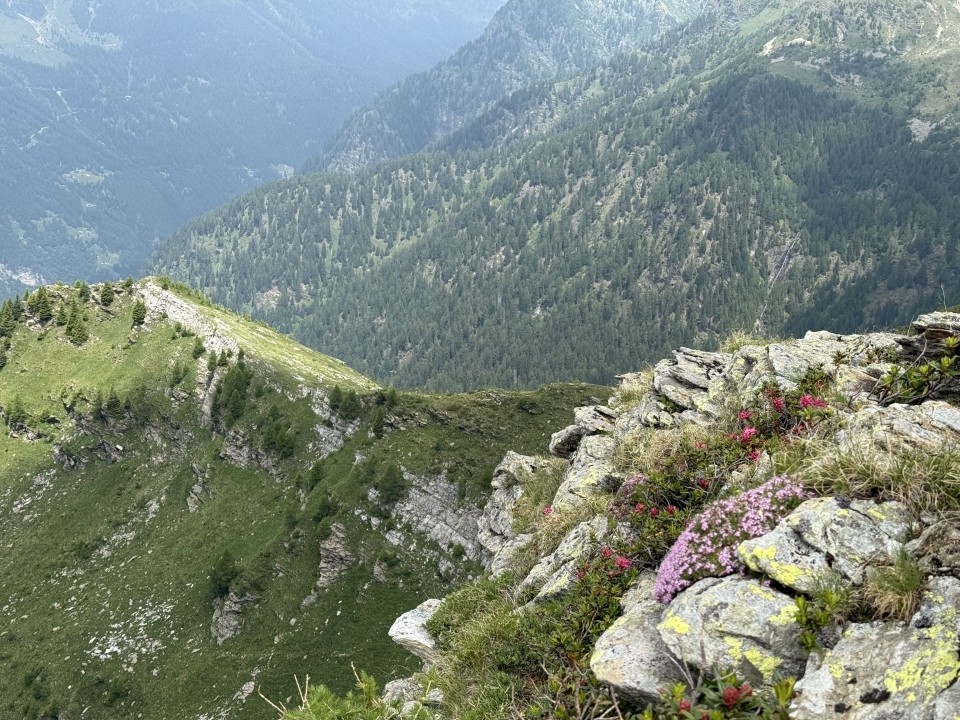 Immerhin, die Sicht ins Tal ist überall zum Reinbeissen schön. Dieses Calancatal bietet schon enorm viel Abwechslung! Unten eng, steinig, in der Mitte weit und lieblich. Laubbäume, dann Tannen und darüber der offene Lärchenwald. Herrlich. Ganz oben meine Spielwiese: Felsen und Blöcke.