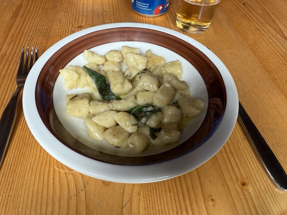 Der Wetterradar hat sich inzwischen umbesonnen und prognostiziert die schweren Gewitter neu erst für 15.00 Uhr. „Ich bin um 14.00 Uhr zum Lunch zurück“ rufe ich dem Hüttenteam zu. „Perfetto, facchiamo dei gnocci!“ versprechen sie mir. Ich grinse breit und mache ich mich auf die Socken, um mir das zu verdienen.