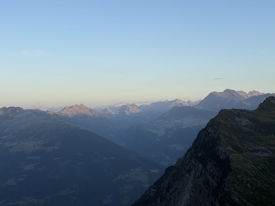Morgenstimmung vor der Adulahütte mit Blick bis zu den Berner Alpen