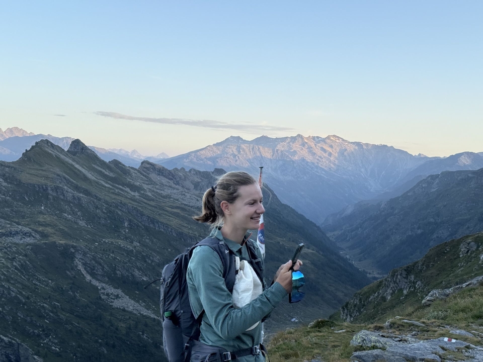 Yael ist startklar – hinter ihr die Piz Medel-Gruppe im Morgenlicht