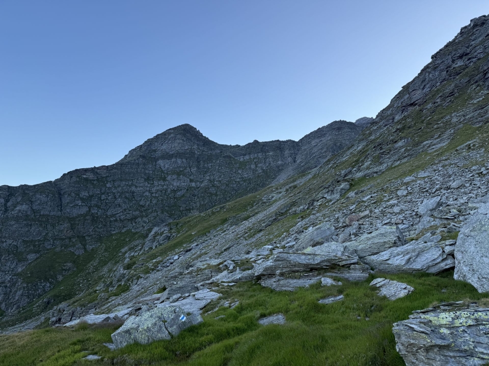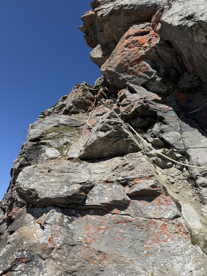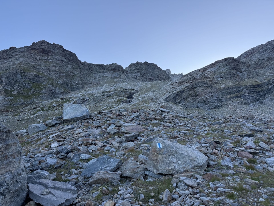 Die meisten Gäste in der Adulahütte haben den gleichnamigen Gipfel (Adula = Rheinwaldhorn) als Tourenziel. Wir hingegen visieren dessen nördliche Gratverlängerung an, die uns ebenfalls über zwei Dreitausender führen wird. Die seit 2025 blau markierte Route beginnt etwa 100 Höhenmeter unterhalb der Hütte. Pfadspuren sind nur spärlich vorhanden, doch das Gelände ist im ersten Aufstieg gut begehbar. Ein erstes, kleines Felsband mit Kette gibt allerdings gleich den Tarif durch: Das hier ist wirklich nur ein Abenteuer für erfahrene Berggänger.