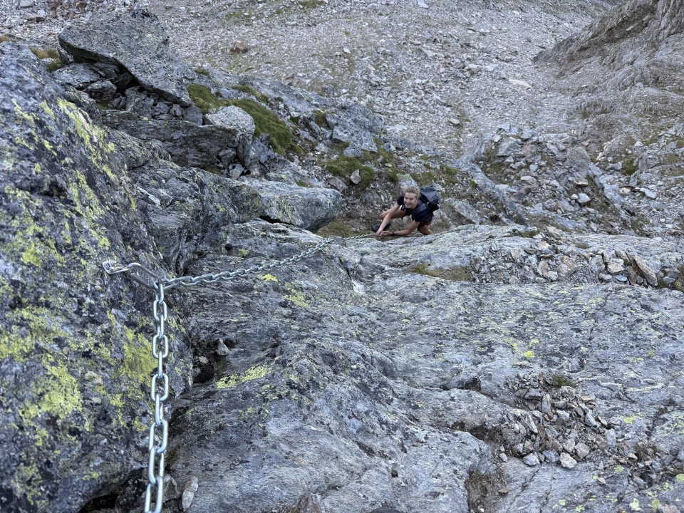 Die Markierungen sind frisch und hilfreich – vor allem dann, als nach einer guten Stunde Steigarbeit ein Felsriegel den Zugang zum ersten Übergang versperrt. Eine lange Kette hilft über die ersten Meter (ohne wäre das schon Kletterei dritten Grades), es folgt genussvolle Blockkletterei im ersten Grad. Yael schluckt zunächst zweimal, als sie merkt, dass sie ihre Komfortzone verlassen muss. Aber da die Griffe gut sind und der Fels fest, grinst sie bald über das ganze Gesicht. Papi hat nicht zu viel versprochen.