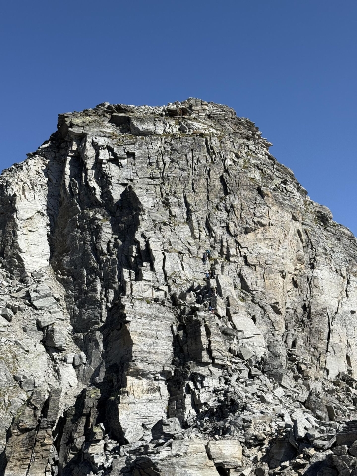 Man würde es nicht glauben… aber die Kletterei hier hoch ist einfacher als jene auf den Piz Cassimoi. Wer sieht die Tessiner in der Bildmitte?