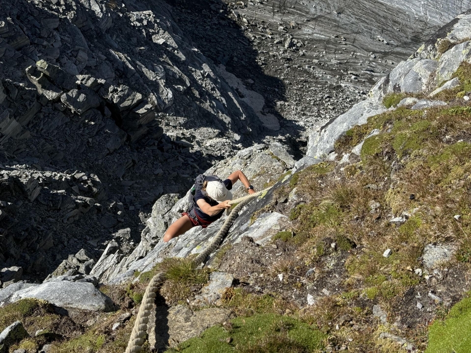 Nach einem steilen Herantasten an die Wand hilft uns ein Seil über ein luftiges Band (das Posterfoto der Via Crio). Yael hat etwas Respekt, ich gehe fortan voraus. Es wird stellenweise sehr ausgesetzt. Doch die Route ist hervorragend markiert und die schwierigsten Kletterstellen sind mit Seilen und Stahlgriffen am richtigen Ort entschärft. So bleibt es durchgehende Kletterei im ersten und zweiten Grad, und das in perfektem, festgriffigem Fels. Grossartig!