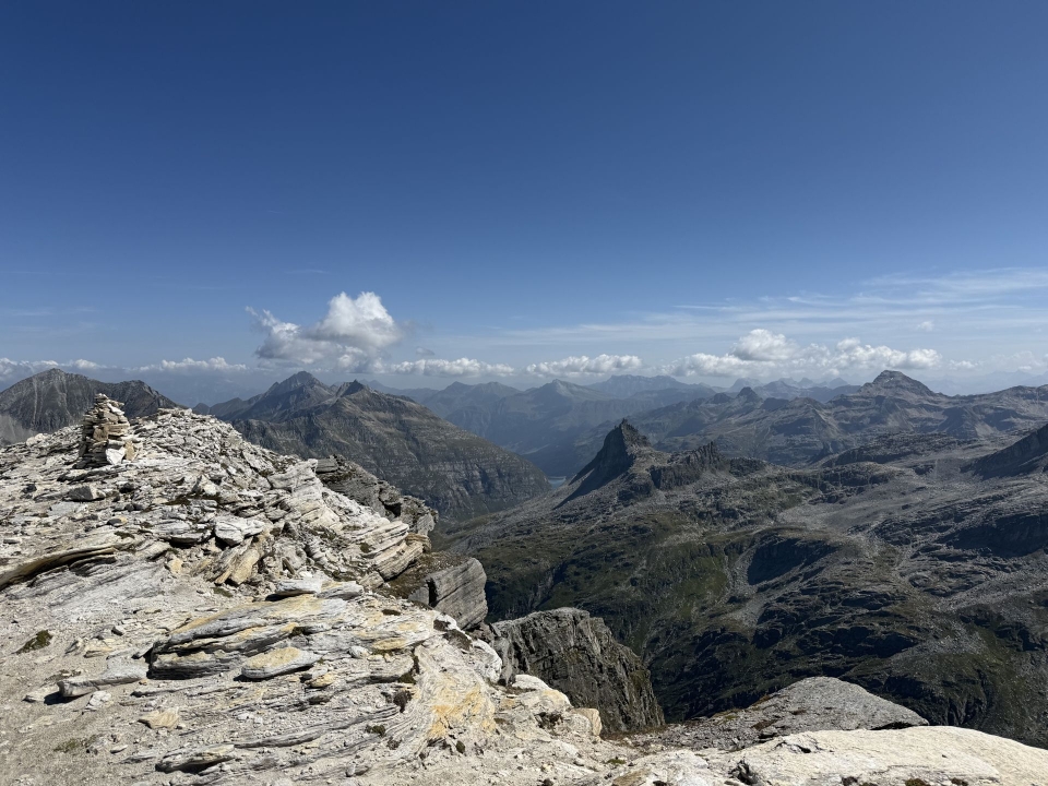 Gipfelblick ins Läntatal zu Zervreilahorn und -see