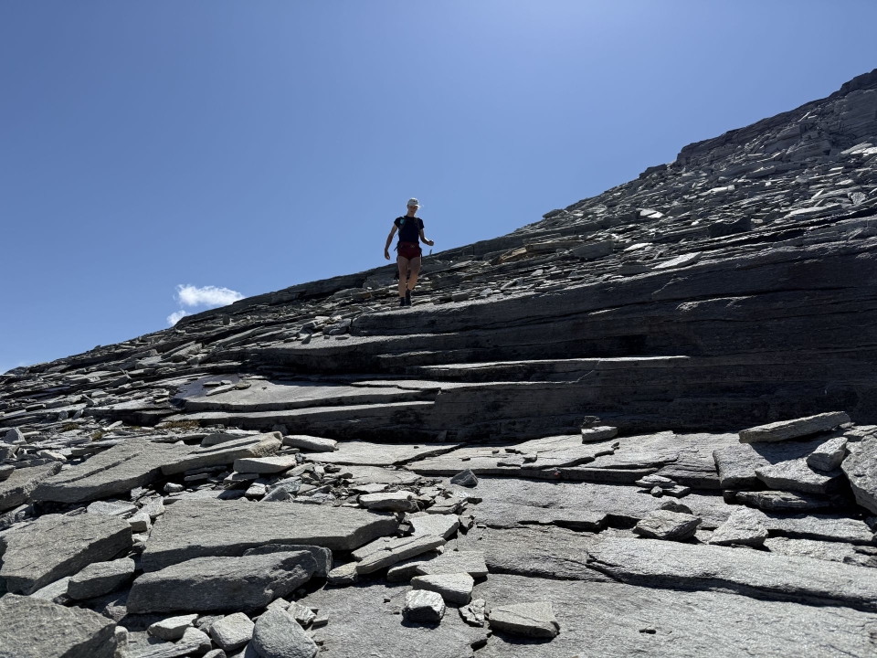 Der Abstieg gegen Norden ist hingegen einfach. Die schön markierte Route hinunter zum Soredapass führt über eindrückliche Felsplatten, die einst vom Gletschereis glattgeschliffen worden waren. Was für ein spannendes Gelände!