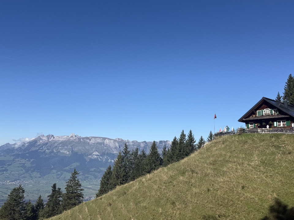 Die Wirtin begrüsst mich freundlich auf Vorarlbergerisch. Auch wenn ich weder Durst noch Hunger verspüre, komme ich nicht darum herum, mir ein Getränk und ein Stück Kuchen servieren zu lassen. Ich schmunzle über mich selbst, ziehe die erste Kleiderschicht aus und setze die Sonnenbrille auf. Weiter geht’s.