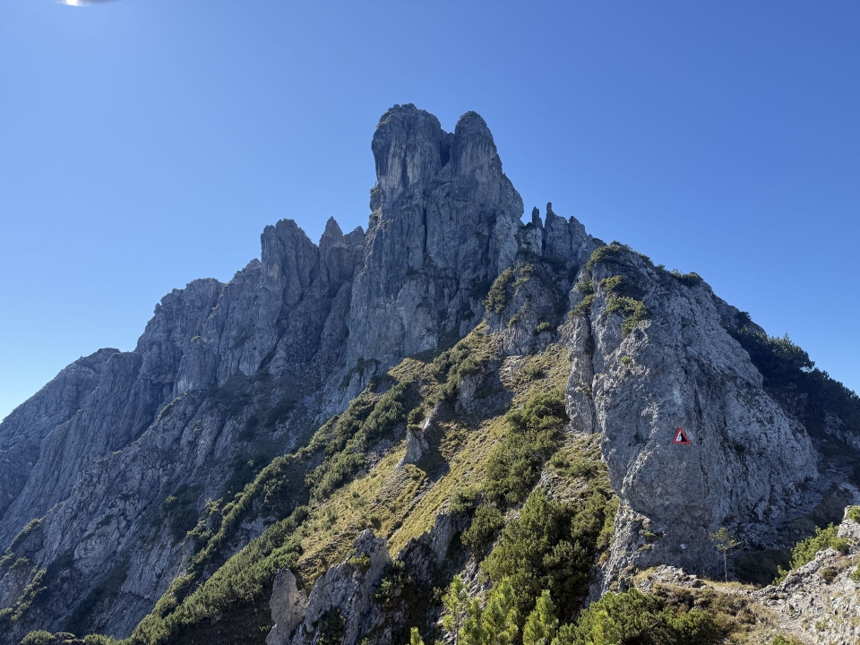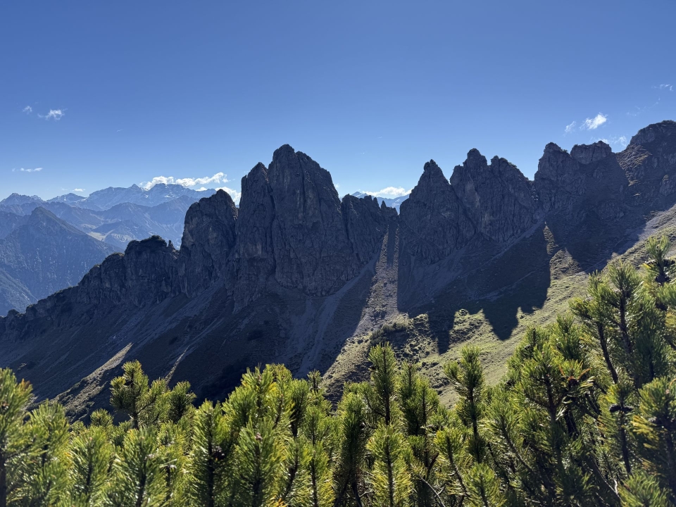 Von hier zieht sich der Pfad weiter bergan. Bald lichtet sich der Wald, und über den Sarojasattel gelange ich in felsigeres Gelände. Die Drei Schwestern treten ins Blickfeld – markante Felsspitzen, die wie Wächterinnen am Grat thronen. Über den ab jetzt blau-weiss markierten Pfad erklimme ich den Gratrücken. Zunächst noch bewaldet, dann mit dichten Legföhren bewachsen, erreiche ich 1’100 Höhenmeter über Planken den Felsriegel. Jetzt beginnt das Kraxelvergnügen!