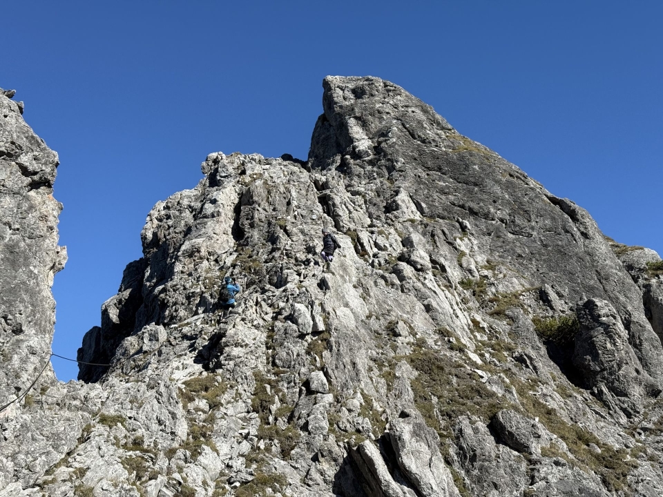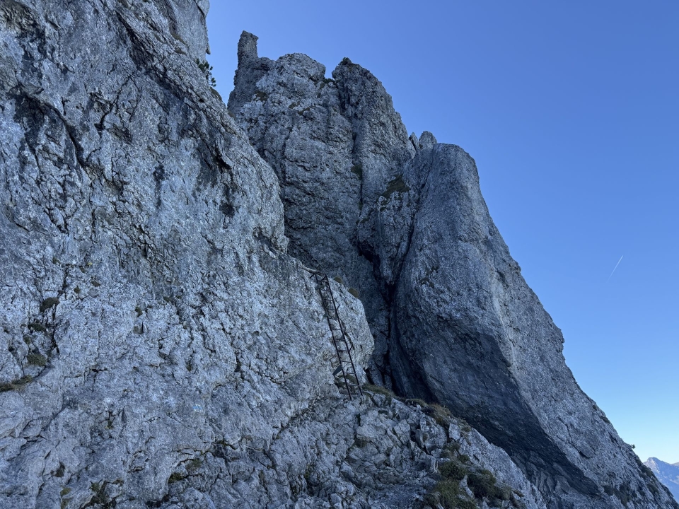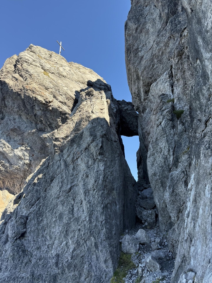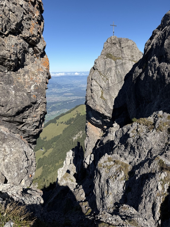 Vor der zweiten Leiter spiele ich kurz mit dem Gedanken, zum Gipfelkreuz der Kleinen Schwester hochzuklettern. Die Griffe wären gut für die kurze Kletterei, doch der exponierte Abstieg danach übersteigt meine Wagnistoleranz. Also folge ich weiterhin dem Steig, der mich bald auf den Gipfel der Grossen Schwester führt.