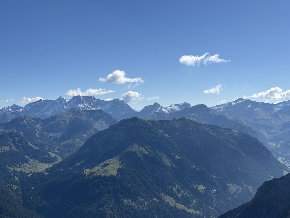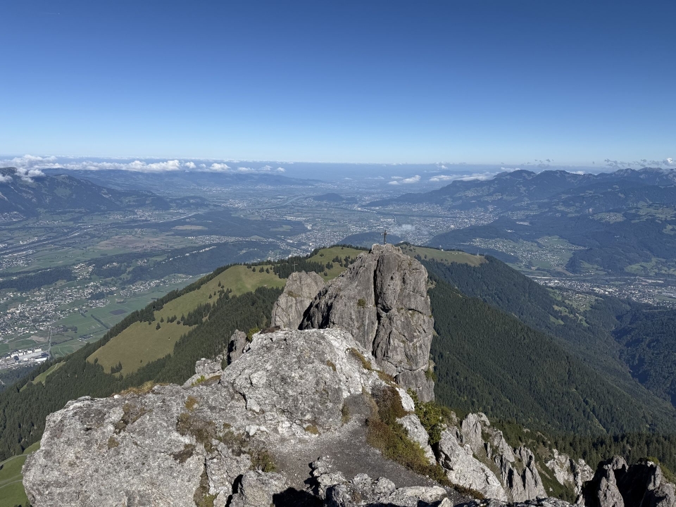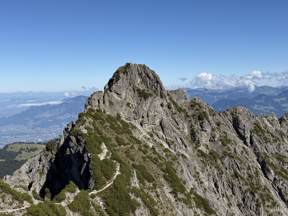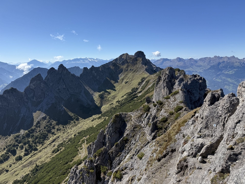 Die Nah- und Fernsicht ist phänomenal. Die Kalktürmchen der Schwestern sind eine Augenweide, doch bald schweift mein Blick im 360-Grad-Modus über Bodensee, Montafon, Rätikon und Alpstein bis zur Alpenkette. Einfach grossartig! Auch die Aussicht auf die bevorstehende Gratwanderung mit drei weiteren Gipfeln ist prickelnd.