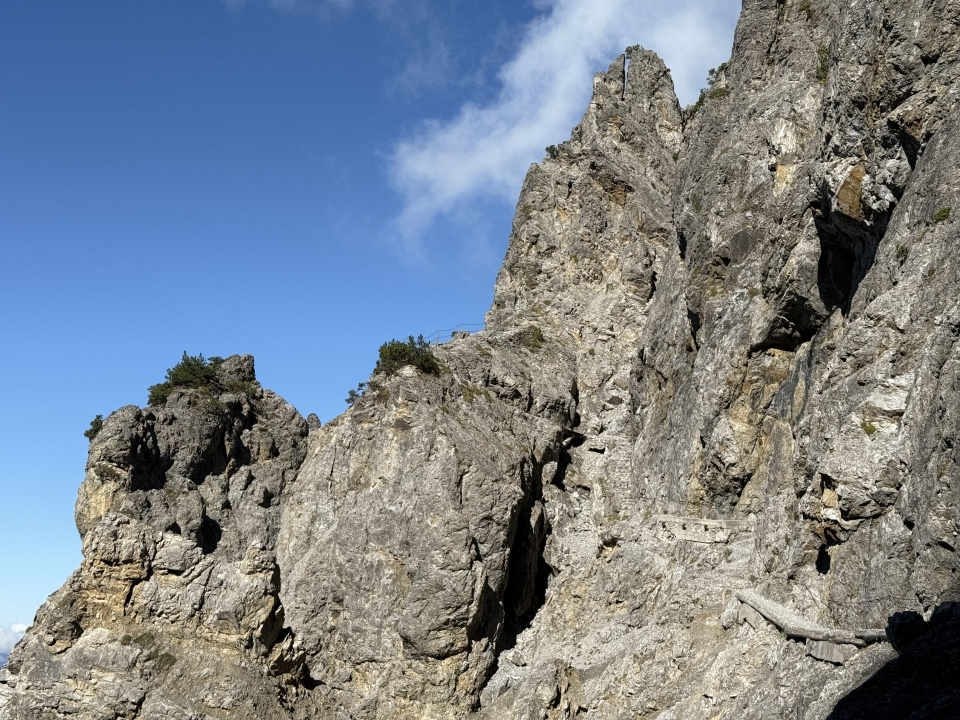 Der Steig durch die Felsen verlangt Trittsicherheit. Unsere Vorfahren haben hier Grossartiges geleistet – und das schon am Ende des 19. Jahrhunderts (1898). Der Pfad ist zwar schmal und ausgesetzt, führt jedoch nie aus der Komfortzone geübter Wanderer. Mehr als T3+/T4 ist es nicht. Die Felspassagen sind zwar steil, doch immer wieder helfen Sicherungen, Stahlseile, Leitern und Holztritte über die Hindernisse. Ich kraxle Schritt für Schritt höher, immer wieder staunend stehenbleibend, um noch bessere Fotosujets zu ergattern.